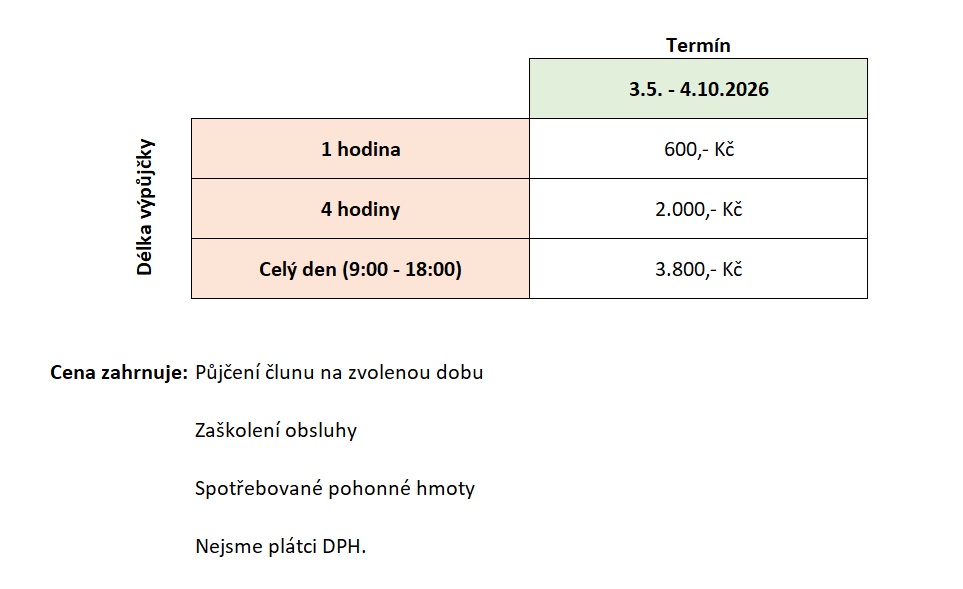 Půjčovna motorových člunů vhodných pro rodinu s dětmi, rybáře, výletníky ke koupání dále od břehu apod. Čluny jsou vybaveny motory o výkonu 3,5 hp a může je tedy řídit osoba be průkazu VMP (vůdce malého plavidla).